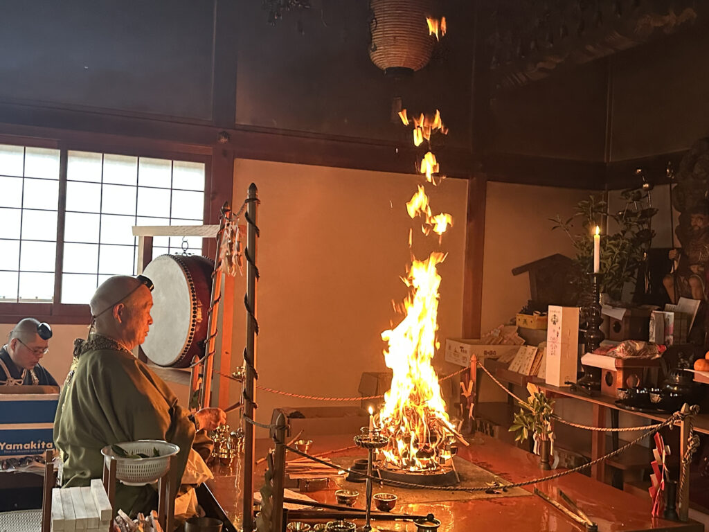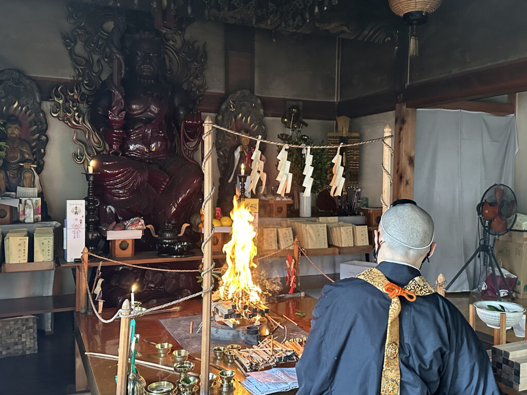 添護摩に入りますと現住職によって再度読み上げを行った後、炉へ焼べさせていただき、ご本尊様の加護を得て諸願成就や除災招福等をお祈りいたします。